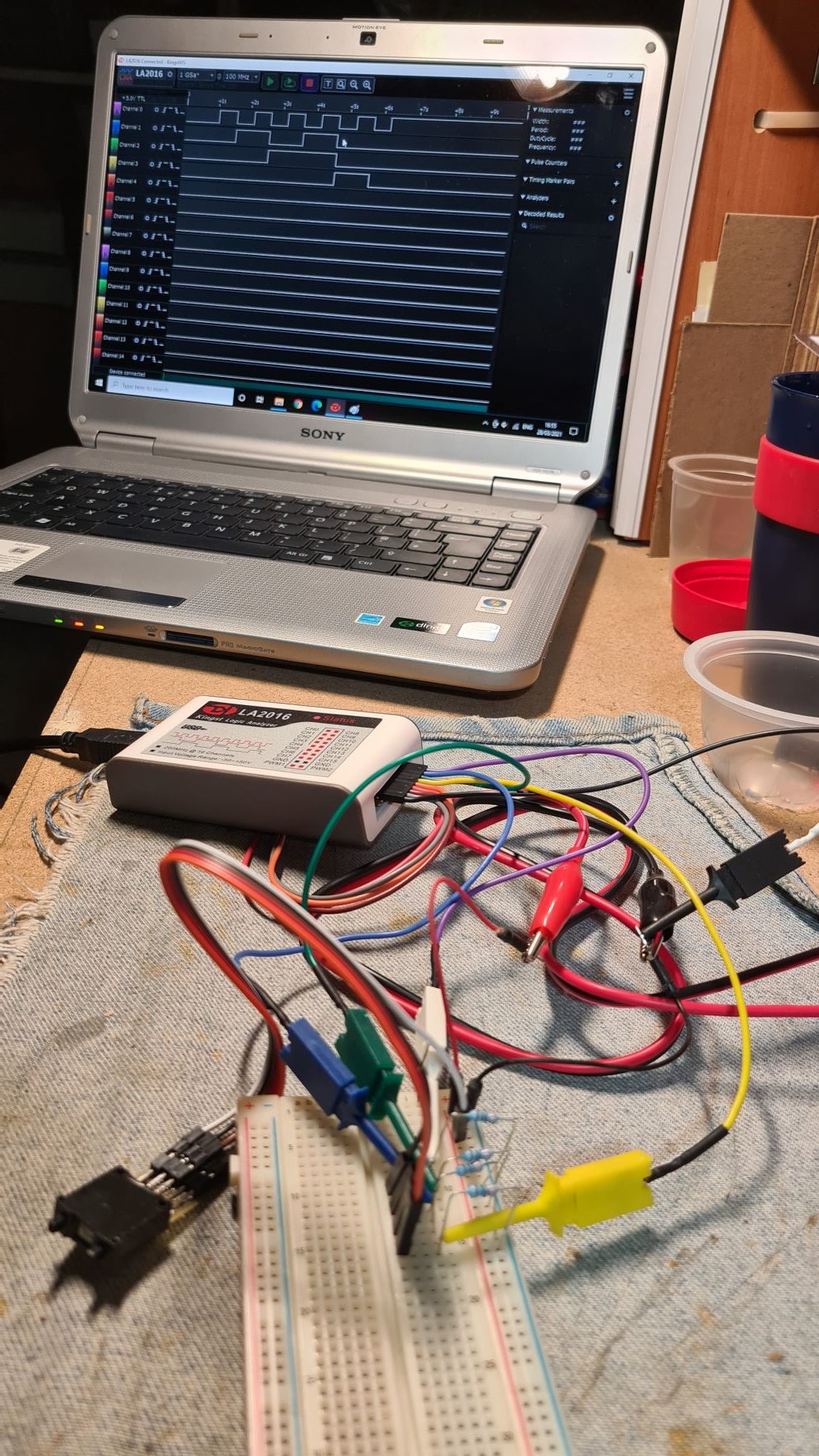 I connected the output from my BCD switch to my logic analyzer. I used the first four channels to display the values as I pressed the up button on my BCD switch. The figure below zooms on the logic analyzer screen shown in the photo above as I rotated the switch from 0 to 9.